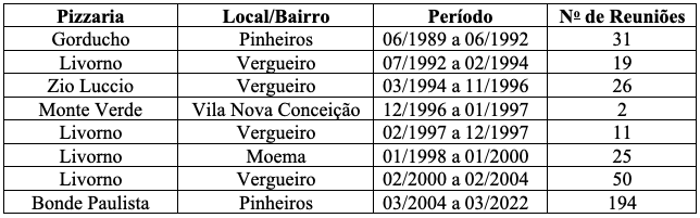 Em 16/7/1992 as reuniões passaram a ser realizadas na Pizzaria Livorno, à Rua Vergueiro, no 2625, onde houve 19 encontros até 17/2/1994. Em seguida ocorreram na Pizzaria Zio Luccio, situada também na Rua Vergueiro, no 2045, onde foram realizados 26 encontros, de março de 1994 a novembro de 1996, até que o estabelecimento foi fechado. Em dezembro de 1996 e janeiro de 1997 houve dois encontros na Pizzaria Monte Verde, na Avenida Juscelino Kubtischek, nos 198/208. As reuniões voltaram a acontecer na Pizzaria Livorno da Rua Vergueiro, de 20/2/21997 a 18/12/1997, totalizando mais 11 encontros.